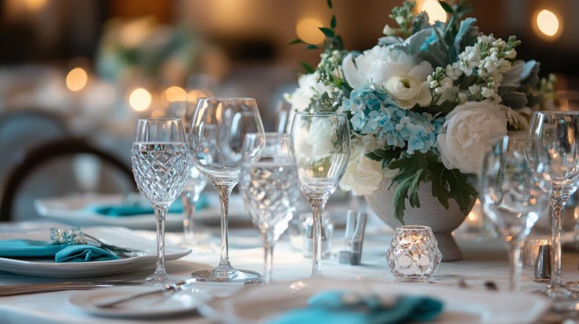 Les bases d'une décoration de table aux couleurs blanc, gris et turquoise